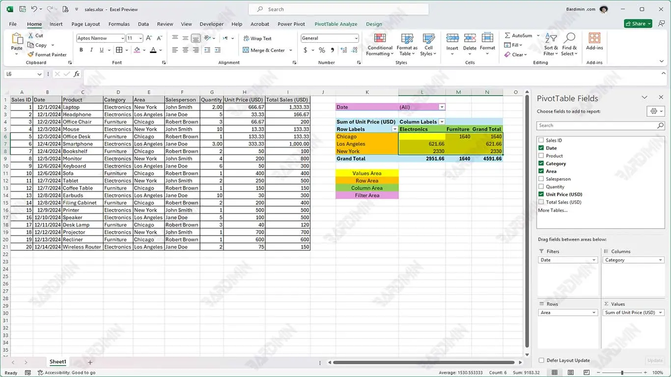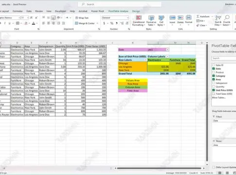Misalnya, Anda bisa membuat tabel penjualan berdasarkan kategori produk. Dengan menempatkan kategori produk di Row Area, Anda dapat dengan mudah melihat total penjualan untuk setiap kategori, yang membantu dalam memahami kinerja masing-masing produk.