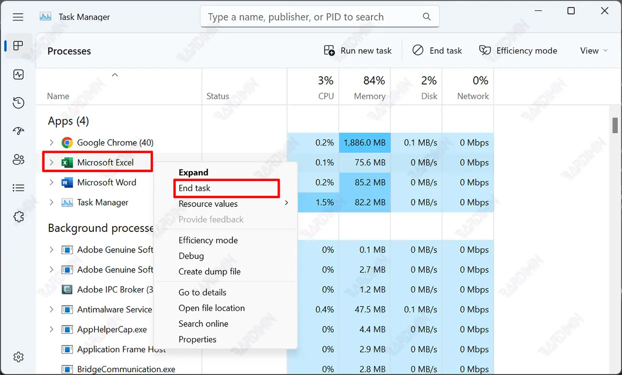 - Pada tab “Processes”, klik kanan Excel dan pilih opsi “End task”.