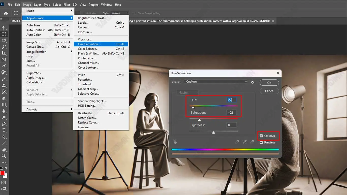 Untuk mendapatkan efek sepia yang khas, atur nilai Hue ke 27 dan Saturation ke 21. Nilai ini memberikan hasil mendekati warna sepia klasik yang sering ada pada foto-foto lama.