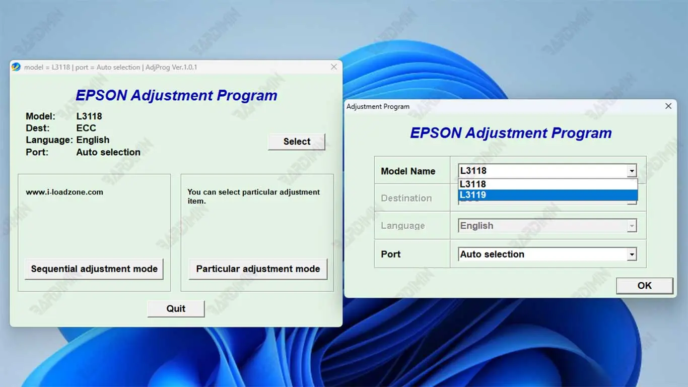 - Na visualização inicial do programa, selecione o modelo de impressora apropriado, ou seja, Epson L3118 ou Epson L3119.