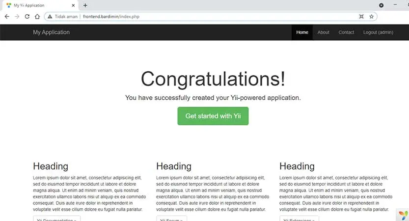 O primeiro comando instala o plug-in de ativos do Composer que permite o gerenciamento de dependências de pacotes bower e npm por meio do Composer. Você só precisa executar esse comando uma vez para todos. O segundo comando instala o aplicativo avançado do yii2 em um diretório chamado yii-application. Você pode escolher um nome de diretório diferente, se desejar. Como vamos instalá-lo no diretório yii2-test, alteramos o comando para