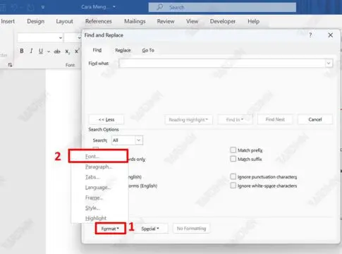 - Abra o menu Formato: Na caixa de diálogo “Localizar e Substituir”, certifique-se de que o cursor está no campo “Localizar:”. Clique no botão “Mais >>” para mostrar opções avançadas. Em seguida, clique no botão “Formato” na parte inferior e selecione “Fonte…” na lista.