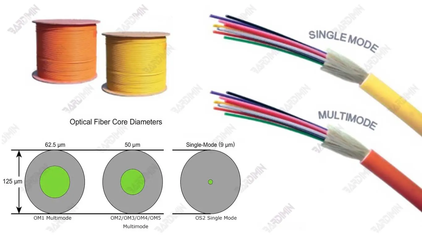 - O modo duplo usa fibra óptica com um núcleo maior, geralmente entre 50 a 100 micrômetros.