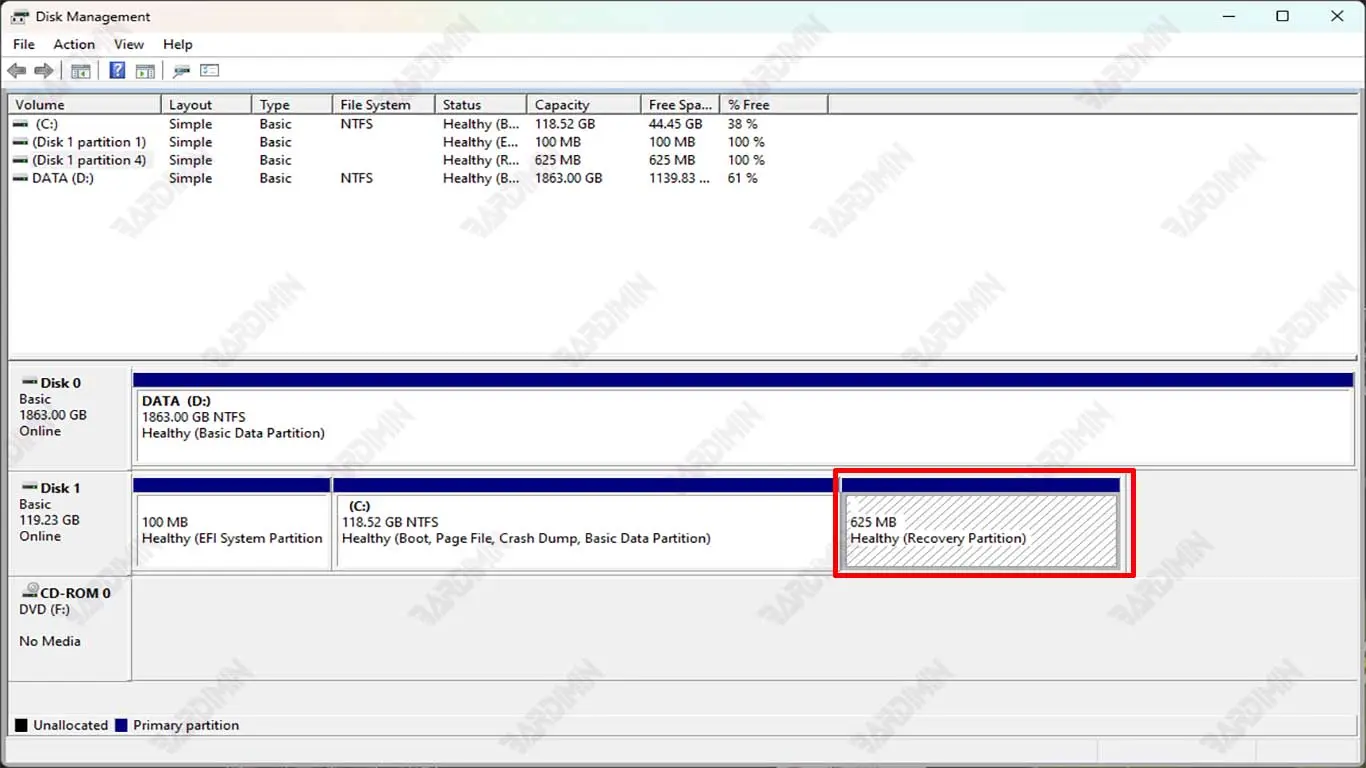 - Na janela Disk Management, procure a unidade rotulada OEM Partition ou Recovery Partition.